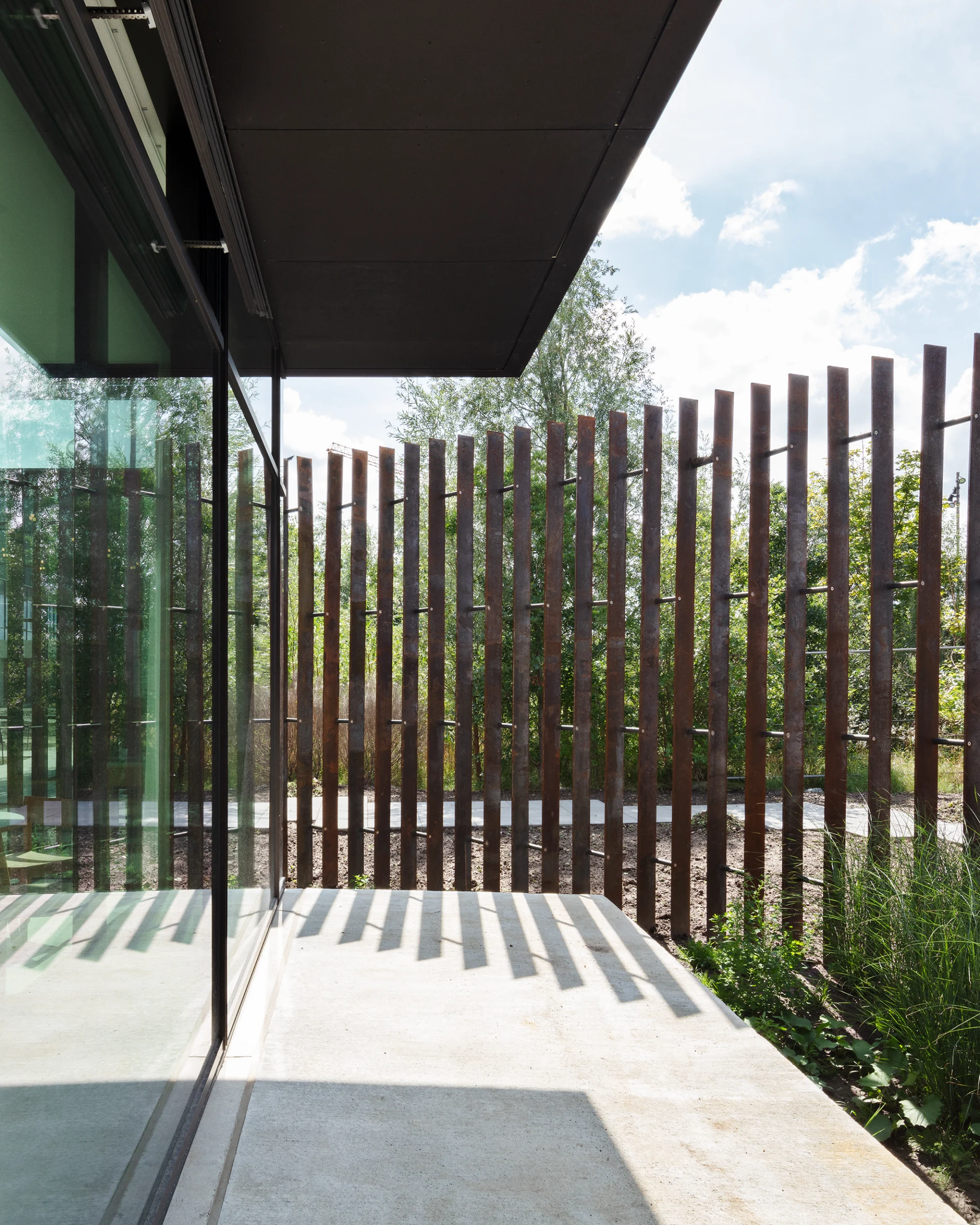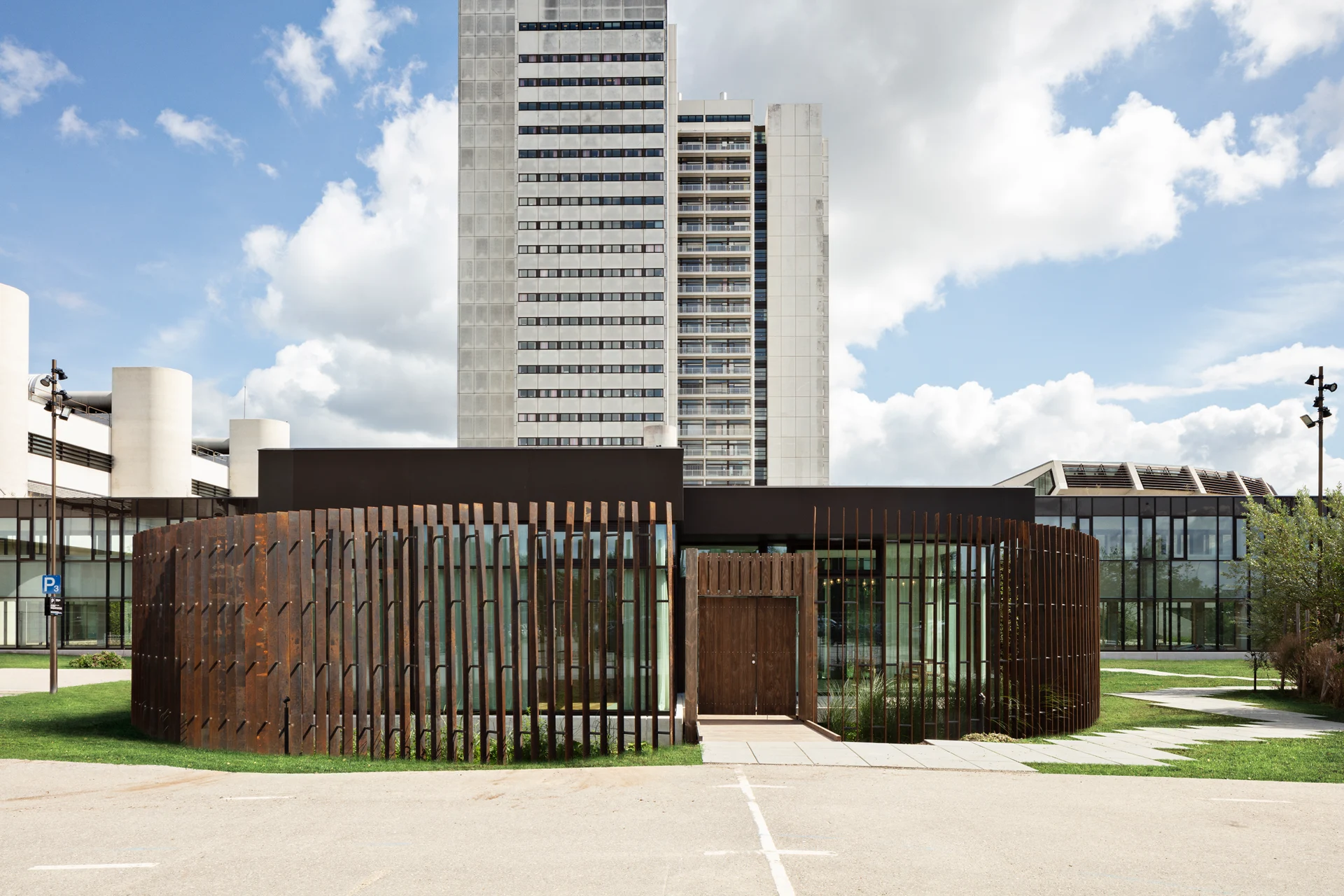 The extension introduces curved, flexible forms, providing spatial fluidity. The two circular buildings are staggered to create sheltered outdoor spaces, improving access to daylight and enhancing the experience of moving through the site. This contrast in forms represents a broader shift in the design of hospitals: from efficiency toward spaces rooted in flexibility and human connection.