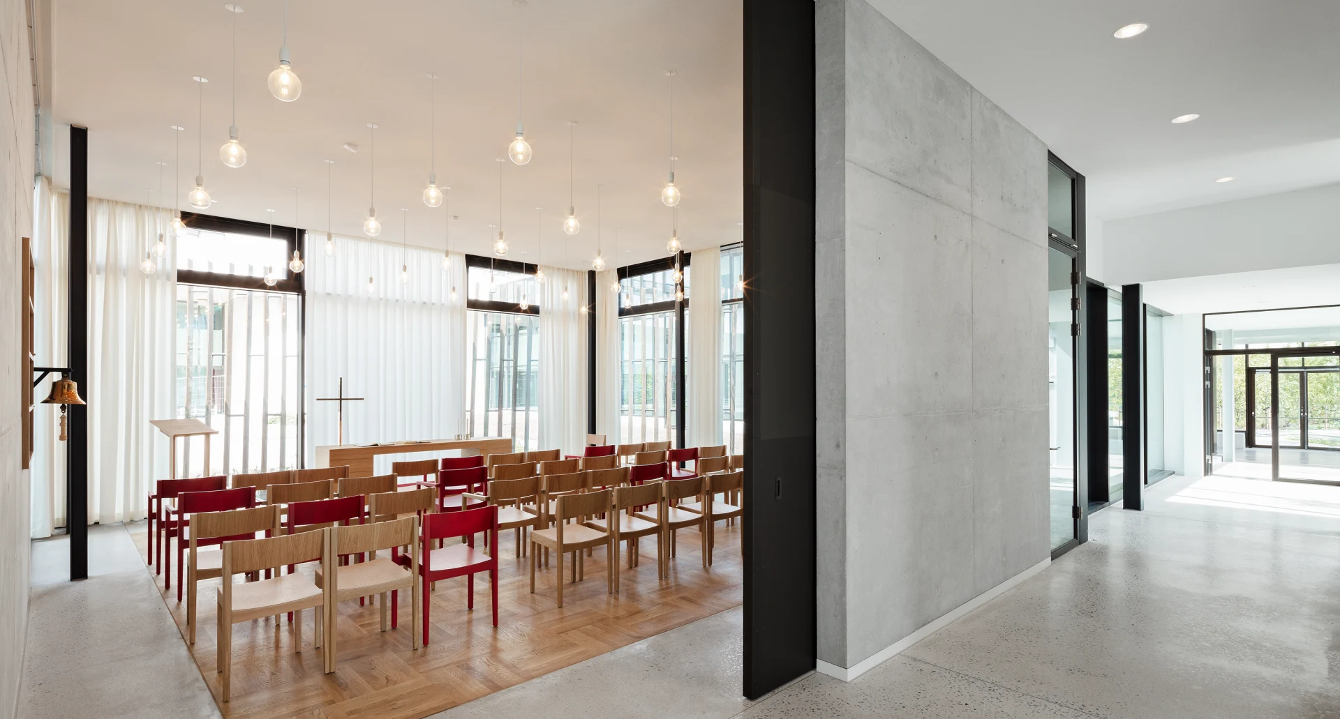 The new facilities also include a religious center, which embraces the differing needs of the hospital’s diverse patients. Completed in 2019, the Center for Reflection and Faith at Herlev Hospital offers a quiet, inclusive space for patients and families. The facility is composed of four primary rooms arranged within a circular outer wall: a Christian chapel, a Muslim prayer room oriented toward Mecca, a non-denominational prayer space, and a shared commons.