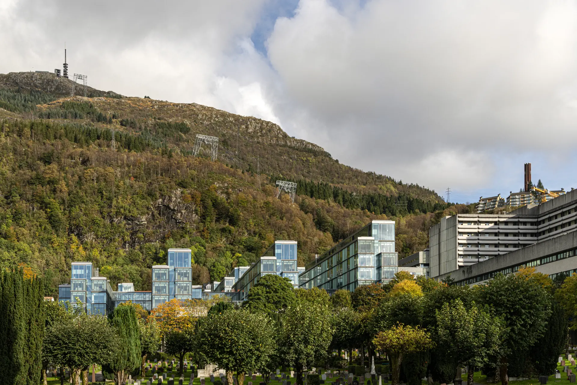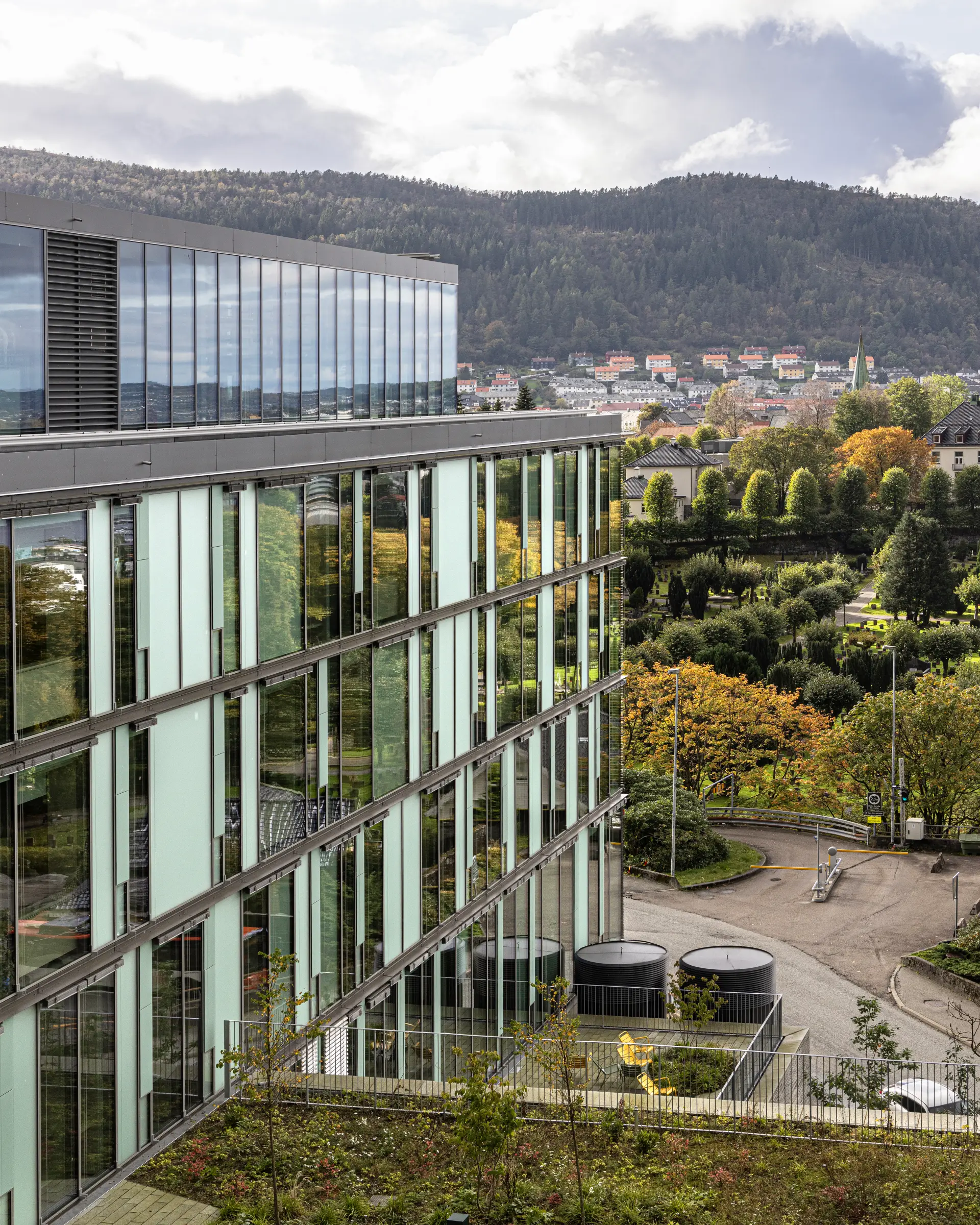 The 79,000 m² facility is broken down into smaller, intimate volumes that cascade along Bergen's mountainous terrain, creating welcoming spaces where natural light and views of the surrounding landscape become integral to the healing experience.