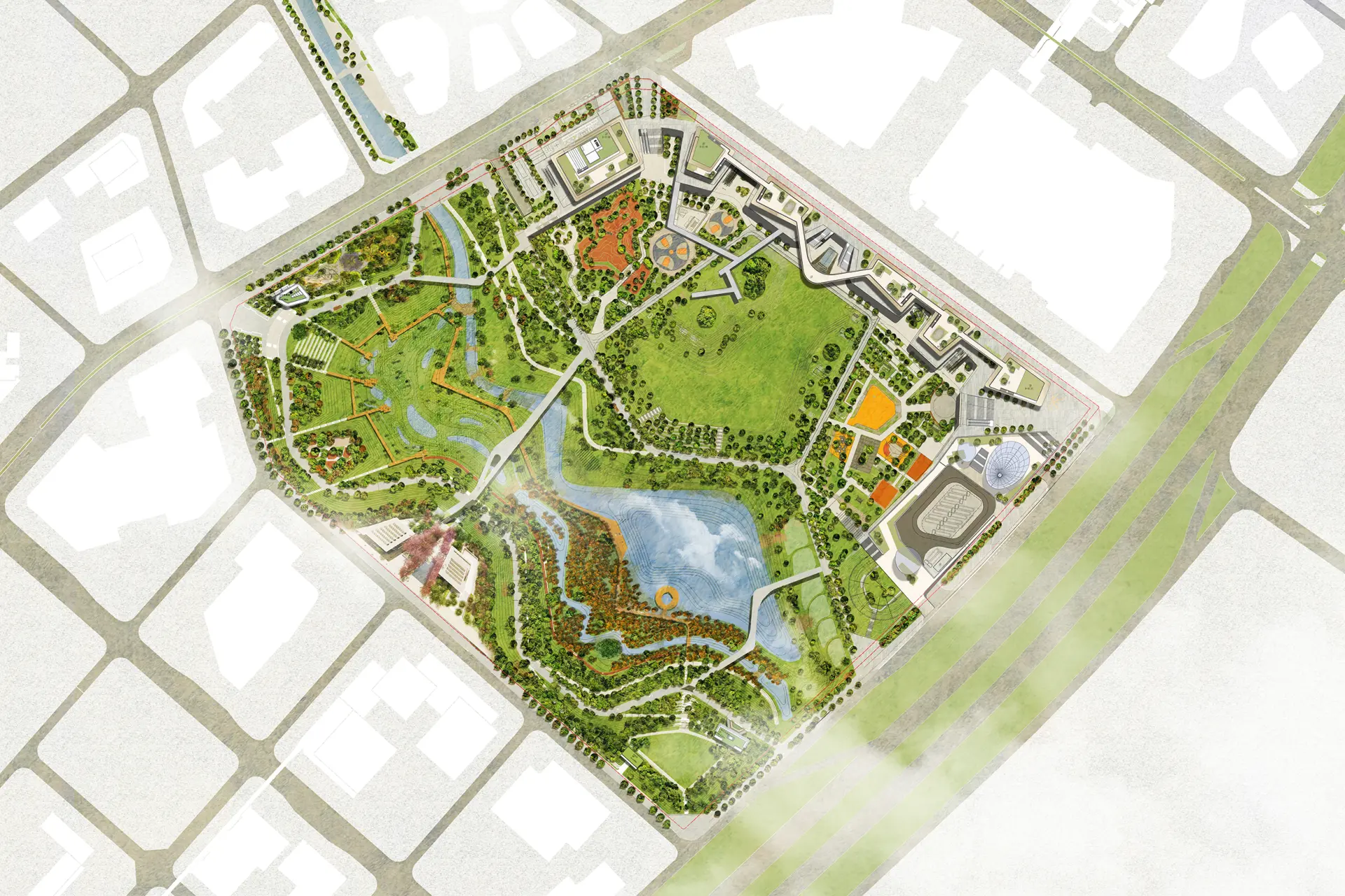 Drawing inspiration from the contrast between natural ecology and the urban core, the park combines efforts to restore natural habitats and enrich wildlife while simultaneously reviving public spaces. Its layout features a dynamic urban ring for social activity along the city’s edge, creating a protective gradient that leads toward the park’s ecological core.