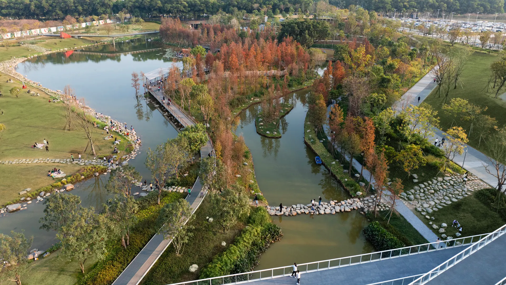 A multi-layered planting strategy and fauna-friendly elements, such as shelters for aquatic life and perches for predatory birds at the Xinji riverbank’s wetlands, create an ecotone that promotes a healthy ecosystem for the park’s wildlife. Over 30 bird species have been spotted within the park, a total transformation from the once inhabitable site where species were spotted sparsely. The park is in perennial bloom, offering visitors dynamic seasonal experiences. Consisting of subtropical native species, foliage of the regenerative landscape turns red in the summer, orange in the fall and winter, and pastel in the spring. This picturesque landscape is a backdrop of many popular social media posts, showcasing Dongguan’s identity through its preserved heritage trees. Beyond aesthetics, plantings were carefully selected for their flood resilient properties – such as the red metasequoia species which thrives in water.