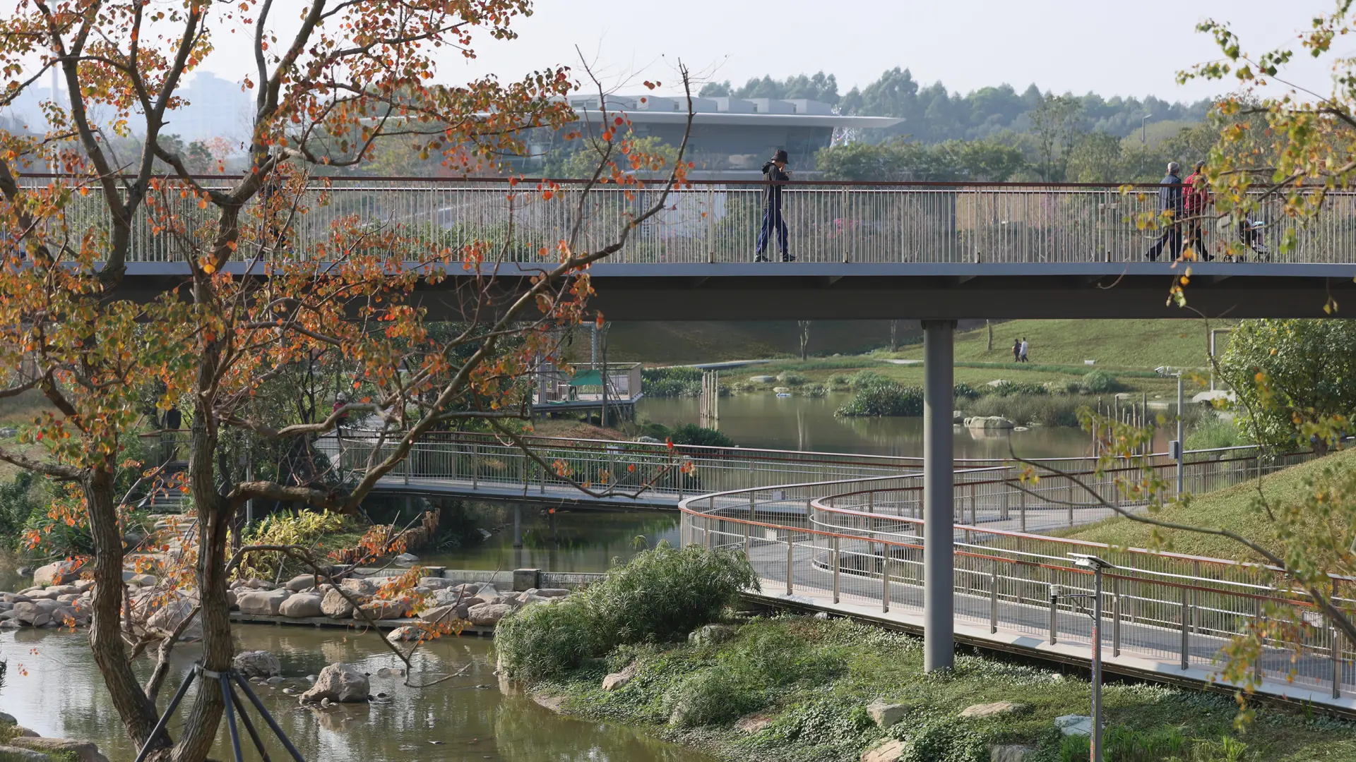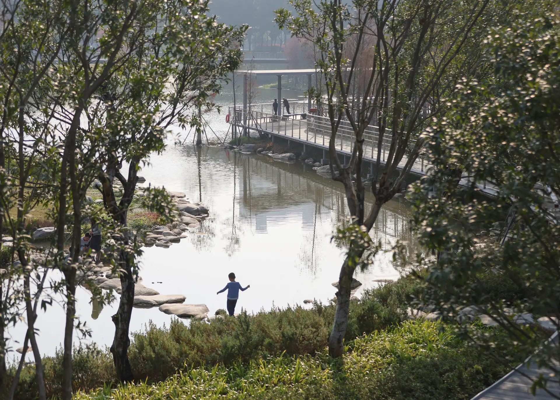 The park's design also includes a dense metasequoia buffer that separates the Xinji River from the Central Lake, improving water quality through natural filtration and creating habitats for aquatic and birdlife. The design encourages public engagement with the river, including an elevated bridge for access. Informed by hydraulic modelling, up and downstream studies, data analysis and rain simulations, the redesign of the Xinji River promotes flood and ecological resilience while turning a formerly polluted waterway into a shared community asset for education and enjoyment.