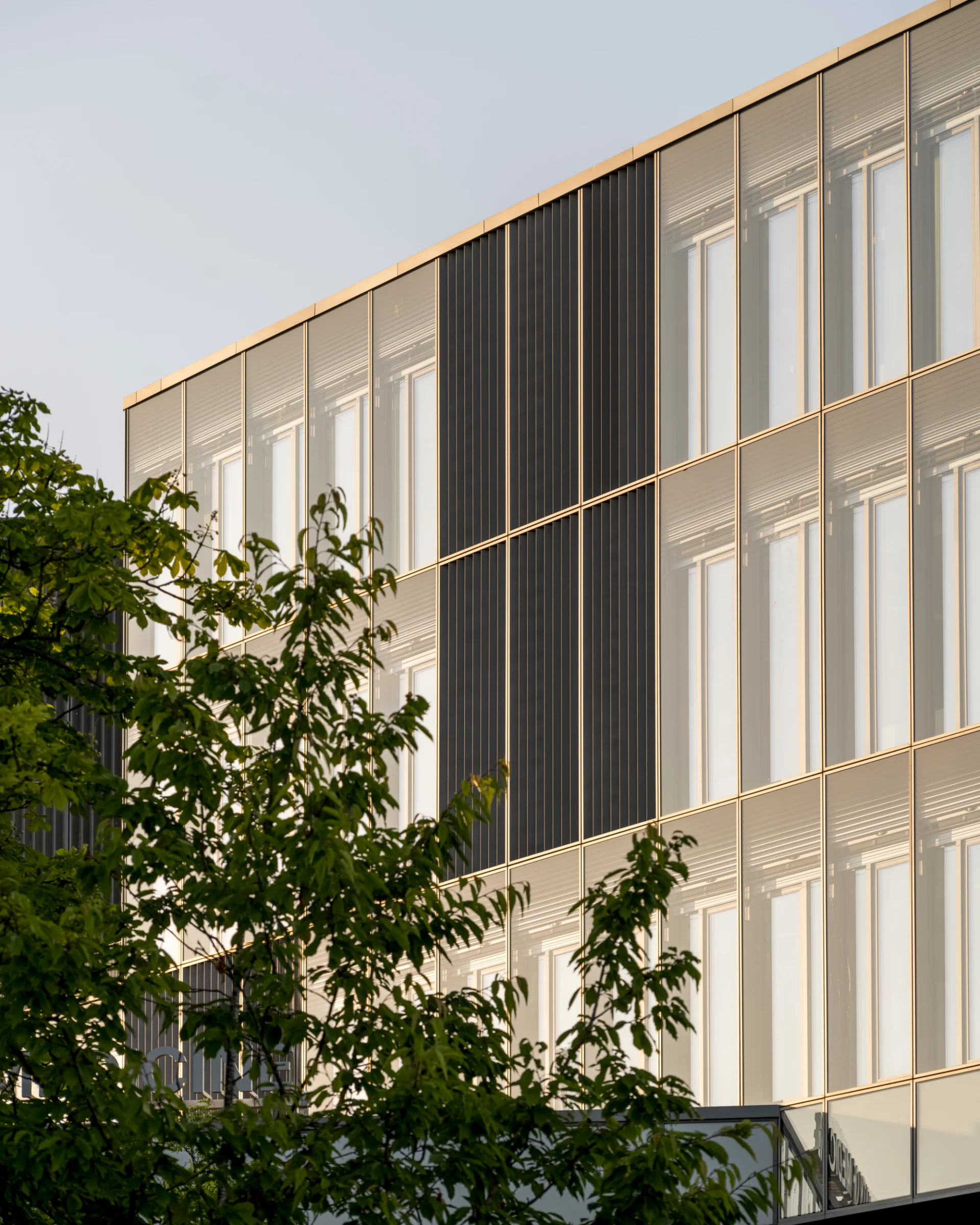 Above the open forum, a building of steel and wood is suspended — rotated 45 degrees relative to the plaza below. The rotation optimizes the footprint on the busy street below, strengthens the building's identity in its context, and generates the terraces and niches that give Forum Medicum texture at street level. The two geometries in dialogue — the open horizontal forum and the angled mass above — give the building a unique appearance.