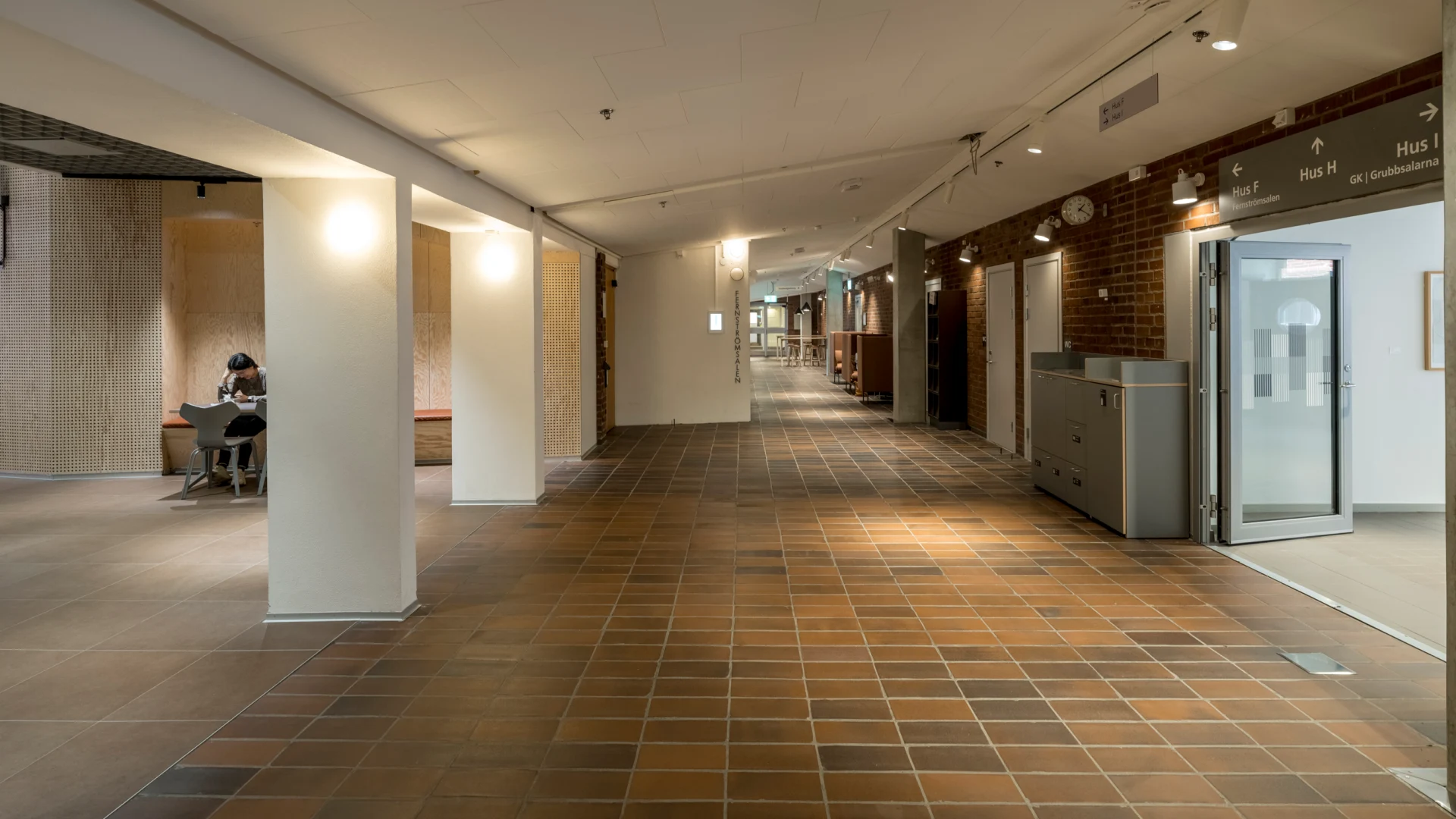 The indoor plaza is the social and organizational spine of Forum Medicum. A café, a restaurant, and a series of meeting points are arranged along its length, each visually fixed to the outdoor spaces beyond. The transparency of the ground floor facilitates programming and exhibitions, informal learning, and the everyday activities of the faculty — all visible to the people of Lund who pass through or pause inside.