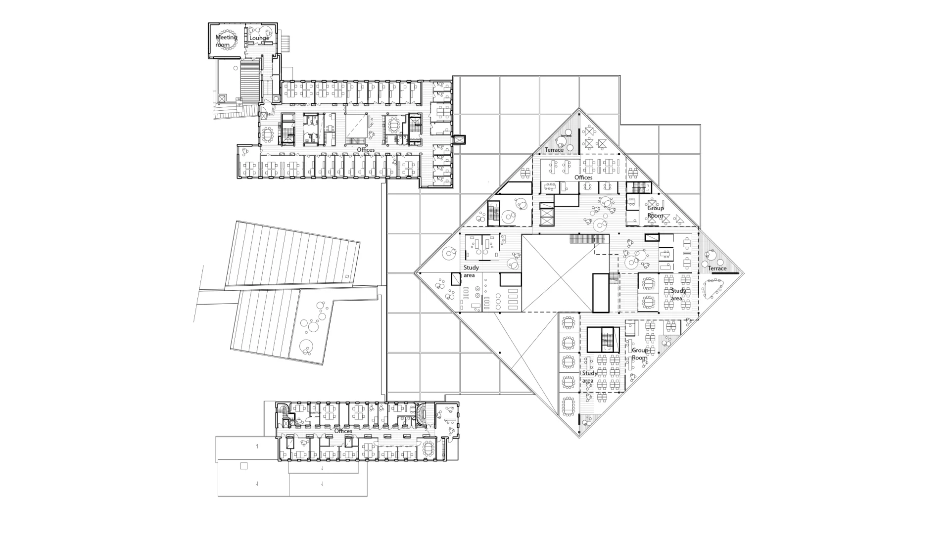 The rotation of the upper building carves out niches and terraces at the edges — sheltered, human-scale spaces for quiet work, rest, or conversation outside. Rather than leftover spaces, they are conceived as places the building makes possible through its unique shape.