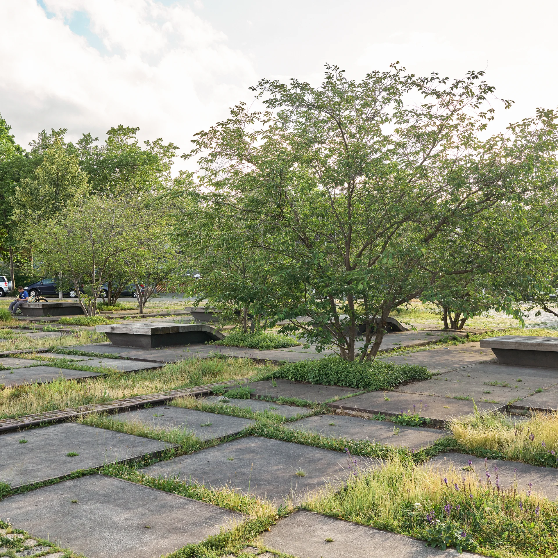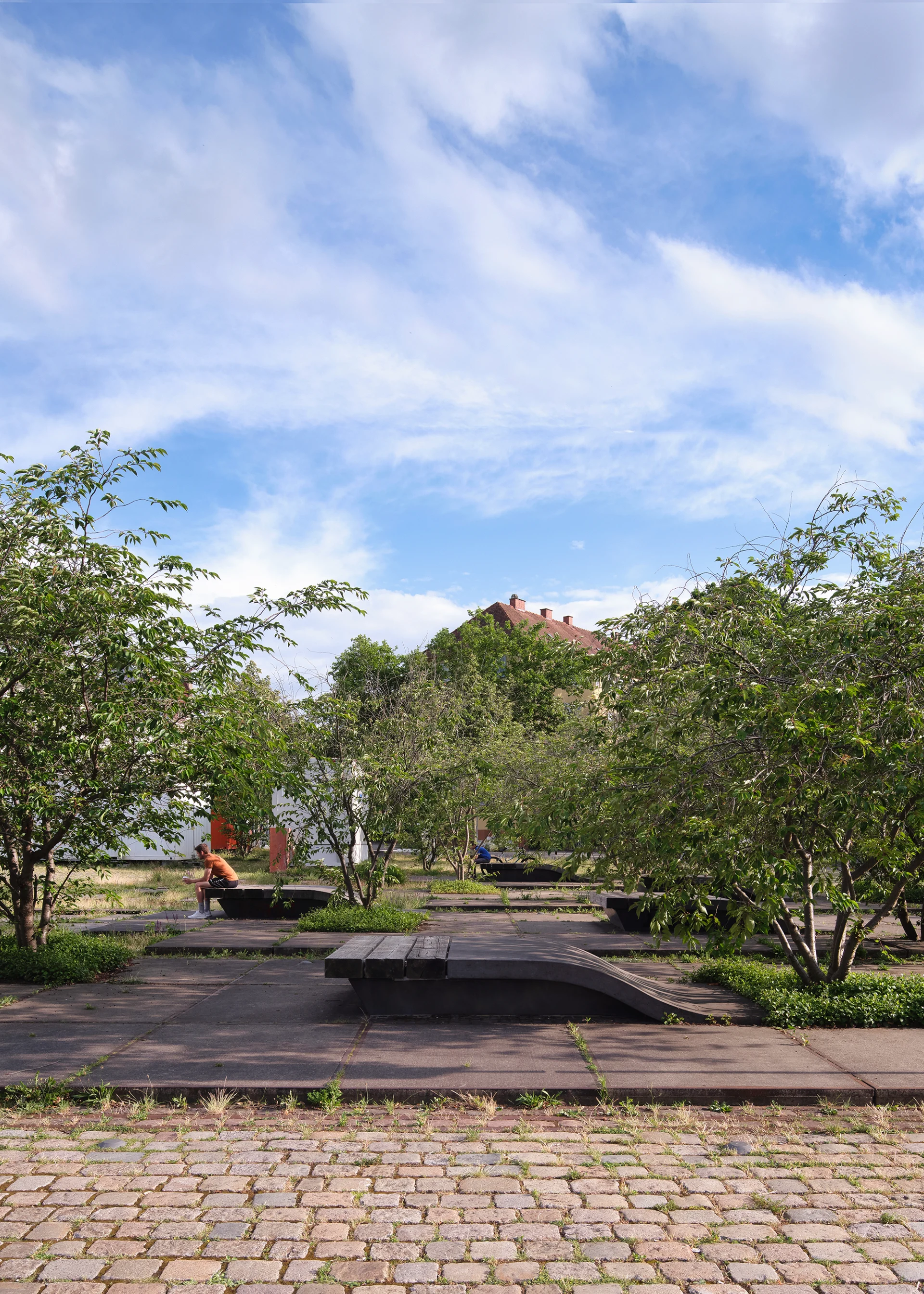 Designed to manage all stormwater on-site, Zollhallenplatz turns infrastructure into landscape, creating a multifunctional urban space rooted in Freiburg’s industrial past.