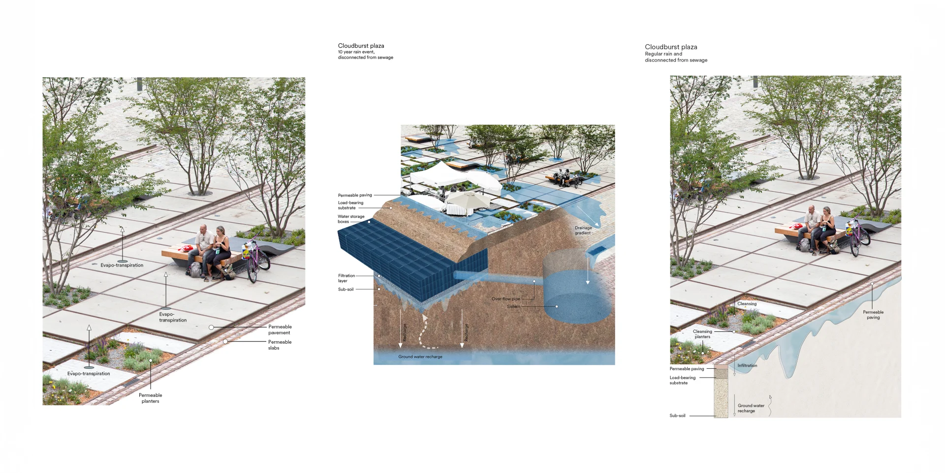 During periods of heavy rainfall, subtly indented areas across the plaza temporarily collect excess water — transforming hardscape into surface flood zones that gradually release into the soil below. Beneath the surface, a network of gravel trenches and stormwater storage volumes retain water, ensuring that runoff becomes a resource replenishing the natural water table rather than a burden on the city's sewerage system. Lush infiltration planters with perennials and grasses are integrated throughout, serving both ecological function and visual character.